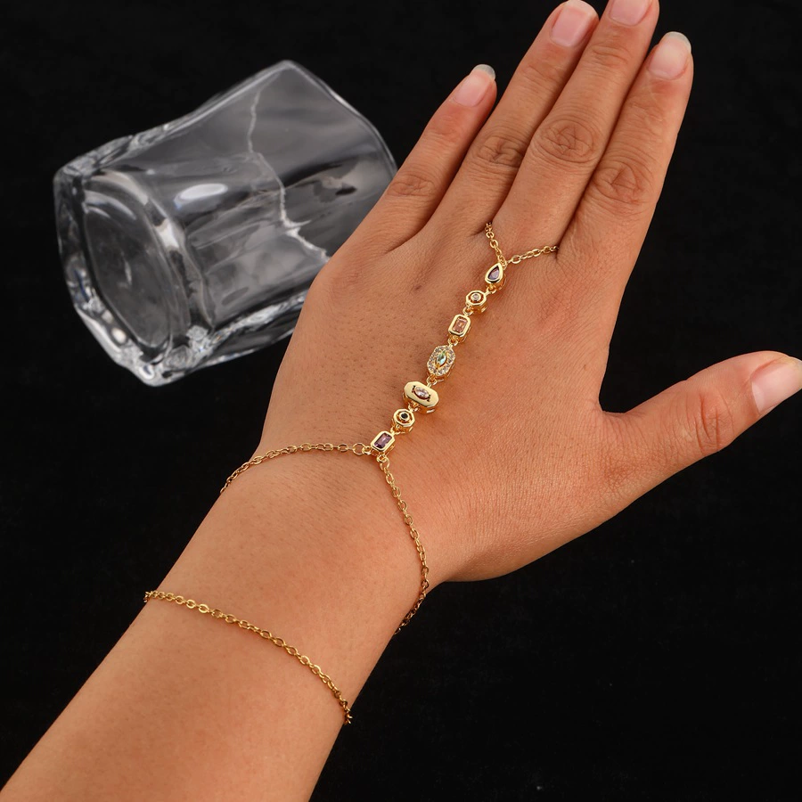 Boho Multicolor CZ Slave Bracelet, Gold Plated Hand Chain Finger Ring, Aesthetic Jewelry for Teen Girls & Festival Wear