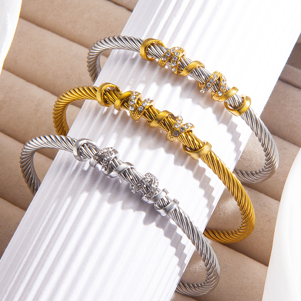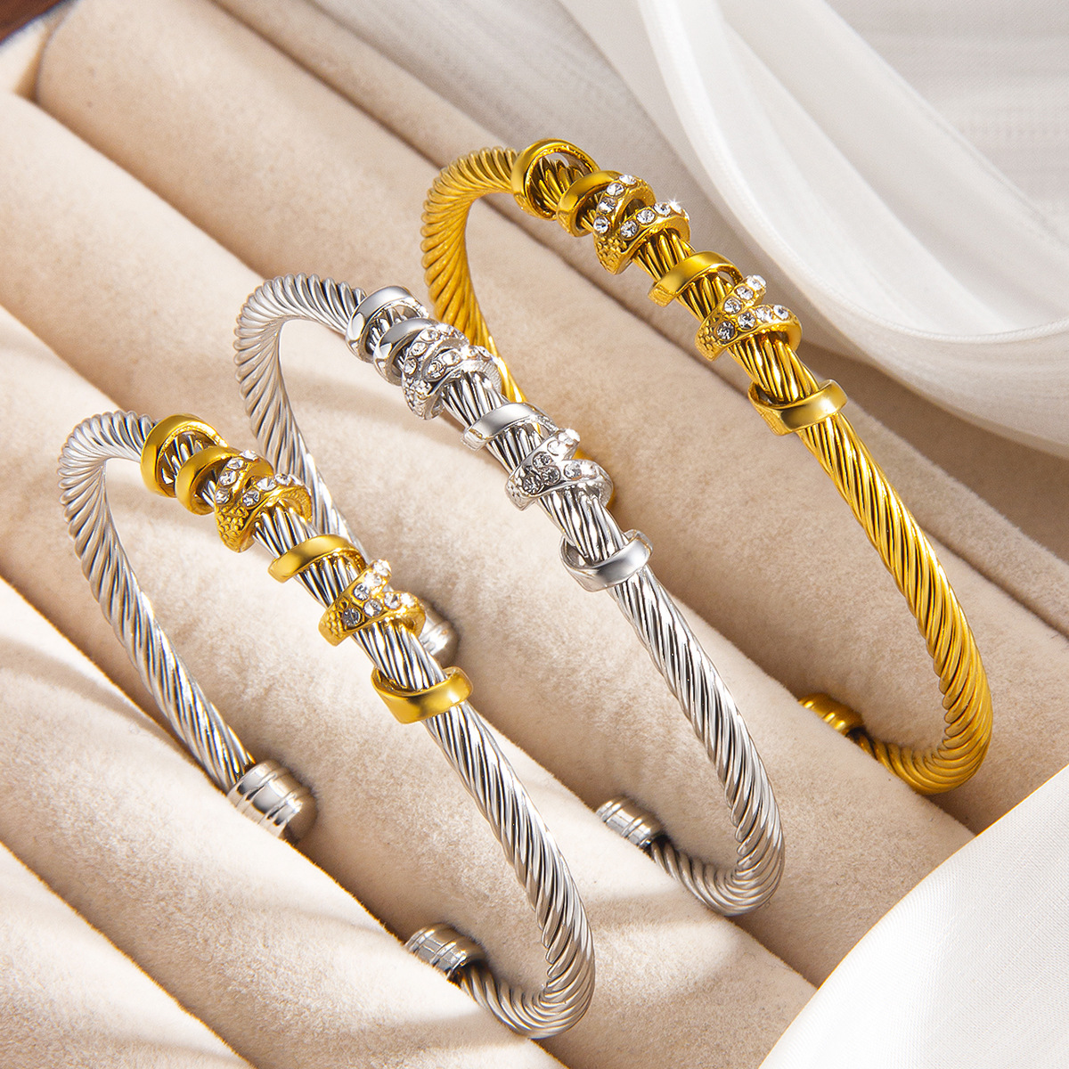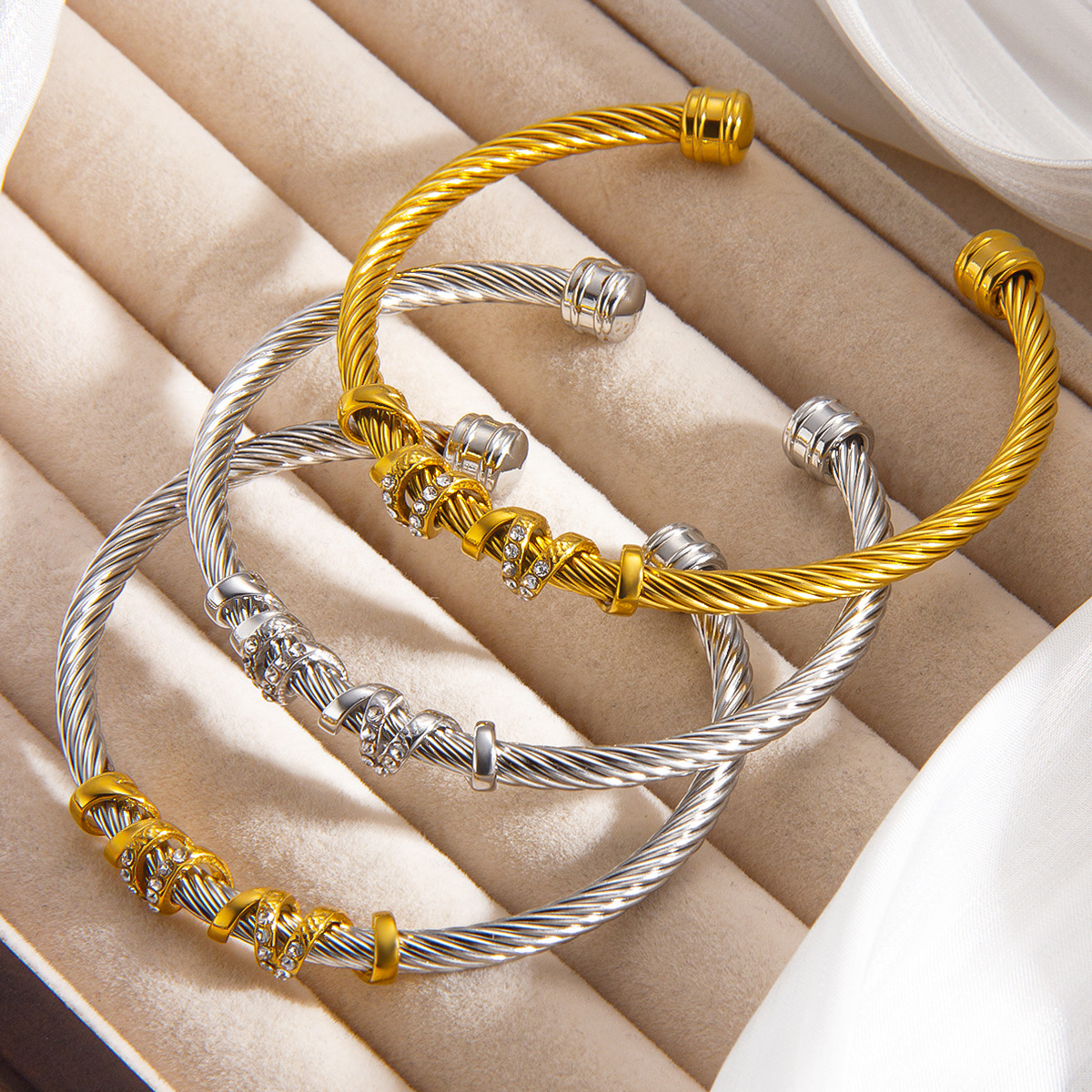 Bulk Stainless Steel Twisted Rope Cuff Bangles, Gold Silver CZ Bead Adjustable Bracelets, Wholesale Fashion Jewelry for Boutiques & Resellers