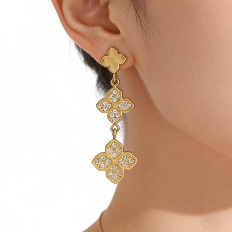 Luxury 18K Gold Plated Clover Dangle Earrings, Vintage Diamond Paved Four Leaf Clover Drop Earrings for Women, Wholesale Stainless Steel Jewelry