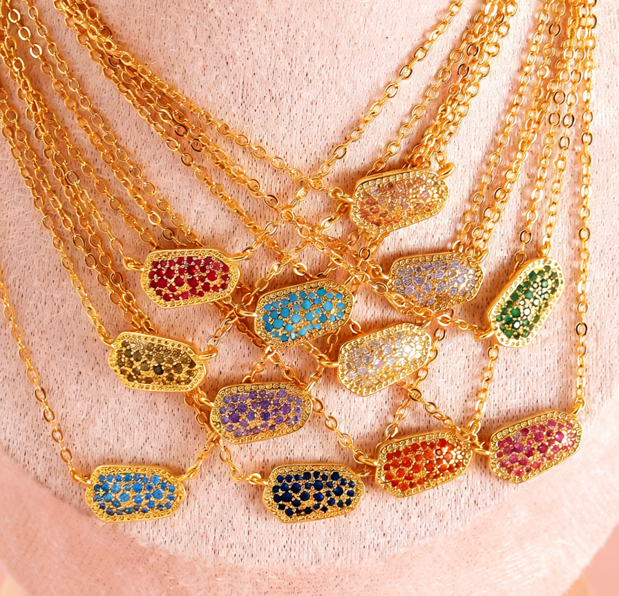 Luxury Gold Plated Paved CZ Oval Charm Necklace, Multi-Color Gemstone Stainless Steel Chain, High Quality Wholesale Jewelry for Boutiques