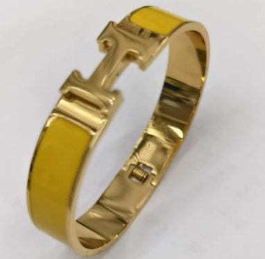 Wholesale 12mm Wide Hermes Inspired H Logo Bangle, Gold Plated White Enamel H Bracelet(multiple colors available), Tarnish Free Stainless Steel Jewelry for Bulk Purchase