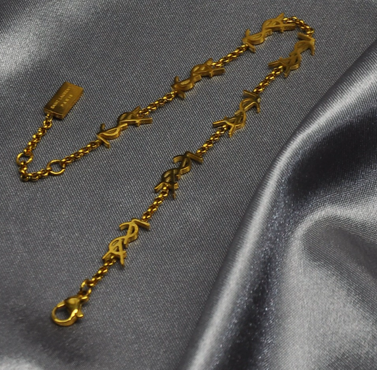 Wholesale 18K Gold Filled YSL Logo Bracelet, Minimalist YSL Monogram Cuban Chain Ankle Bracelet, Tarnish Free Stainless Steel Jewelry for Bulk Purchase