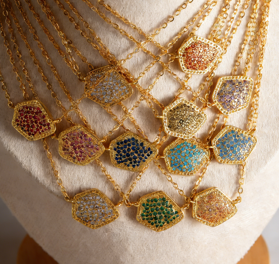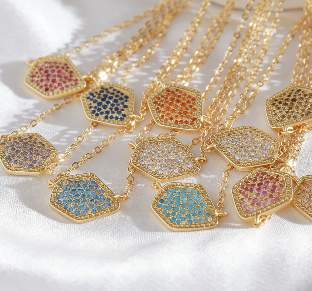 成为第一个“Wholesale 18K Gold Plated Multi-Color CZ Hexagon Pendant Necklace, Paved Crystal Stainless Steel Chain Necklace, Tarnish Free Fashion Jewelry for Bulk Purchase” 的评价者